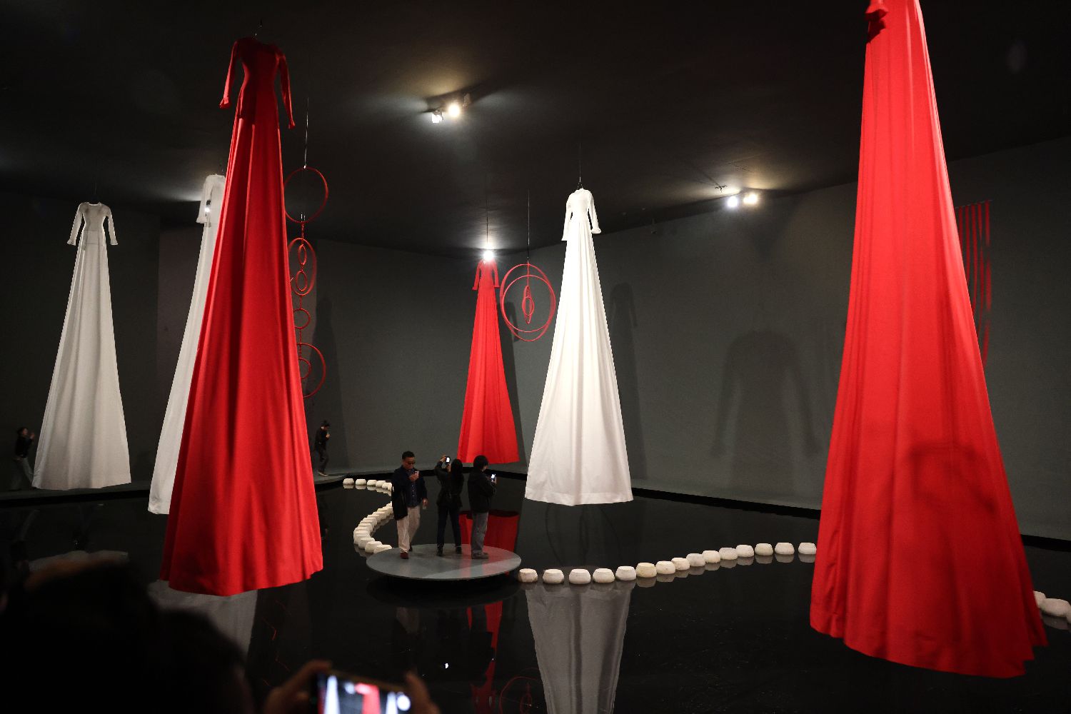 2025年3月22日,由巨型红、白连衣裙等组成的装置作品《多重现实》吸引参观者欣赏。(卞亚文 摄)