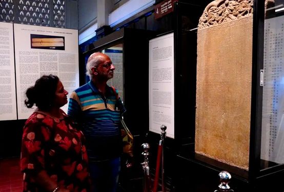 观众4月17日在斯里兰卡科伦坡国家博物馆参观郑和遗存《布施锡兰山佛寺碑》。(图/新华社)