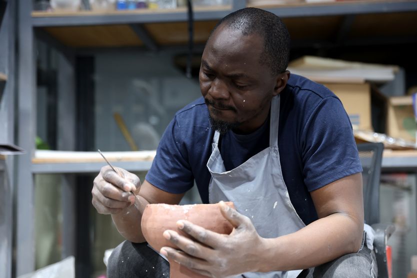 3月26日,在江西景德镇陶溪川国际工作室,尼日利亚艺术家克里斯(Chris Klay)正在进行陶艺制作。(图/中新社)