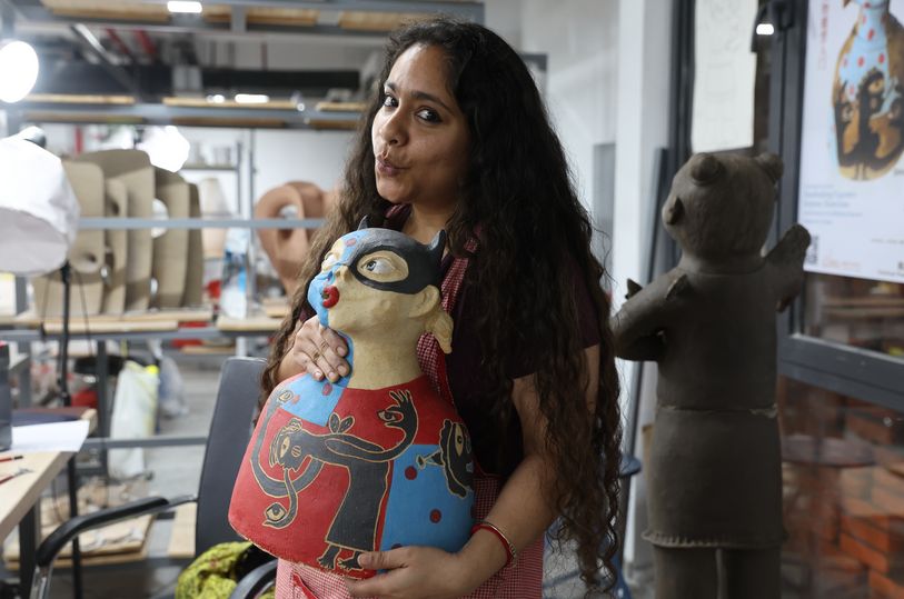 在斯里尼亚·乔杜里的工作台上,泥坯造型奇特有趣,同时绘制着俏皮可爱的图案,丰富多彩的颜色更添一份印度风情,作品既保留了印度雕塑的繁复韵律,又浸润着景德镇传统技艺的质感。在景德镇,斯里尼亚·乔杜里找到了文化交流与融合的无限可能。她表示,希望通过自己的作品,让更多人了解印度文化与陶瓷艺术融合的魅力。