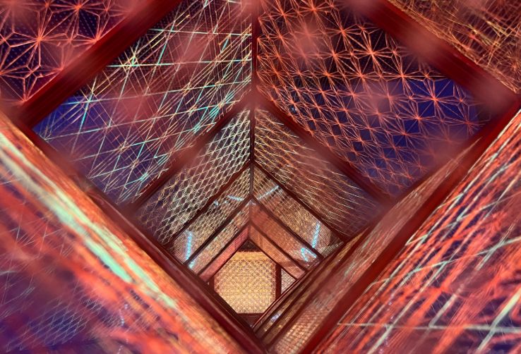 穿行在刁娟的丝线世界中,蜀绣的传统纹样被艺术化地革新表达,又在光影之间被无限放大。光一直是她作品中的重要元素,在光影烘托下,丝线织就的图案与色彩,会随着观者视线的变化而流转出星河般的波光效果。