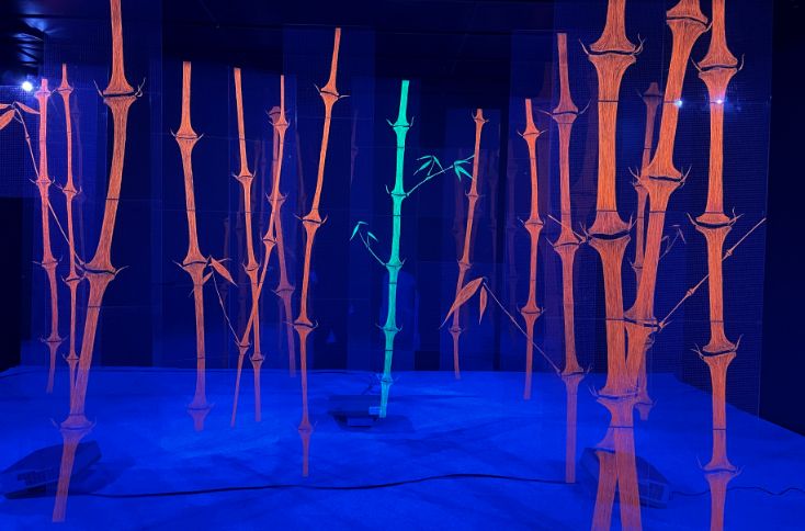 借助全息投影技术的光影效果,《赤色晚秋》中,红色蜀绣竹子醒目地营造出东方意境。她将中国传统非遗与当代科技技术碰撞,让人惊讶,传统非遗也有如此炫目多元的一面。