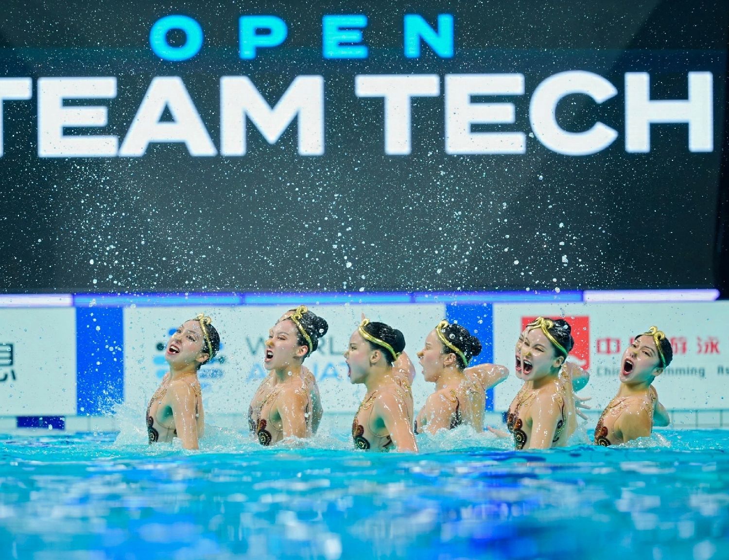 在比赛首日进行的集体技术自选项目金牌争夺中,由冯雨、常昊、向玢璇等奥运冠军坐镇的中国队以中国国产游戏《黑神话:悟空》为主题,将浓郁的中华文化与中国元素展现于泳池之中。作为中国花样游泳队在世界大赛上首次使用的一套全新动作,最终获得全场最高的277.2258分。