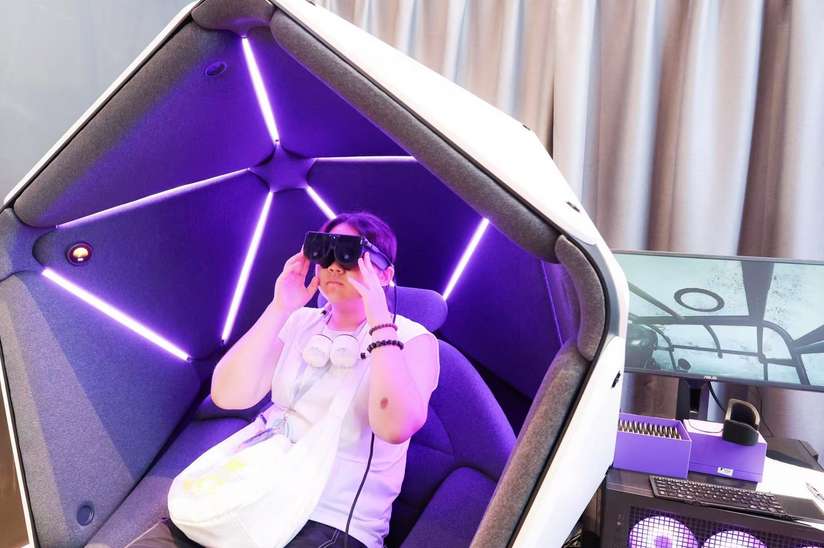戴上头显设备,坐入球状座舱,仿若“穿梭”进80年前的轰炸机驾驶舱,在轰鸣声中体验飞行的紧张刺激;“降临”《奥托的星球》,在捏合、挥手等手势间转动小星球,自由选择探索星球的视角……