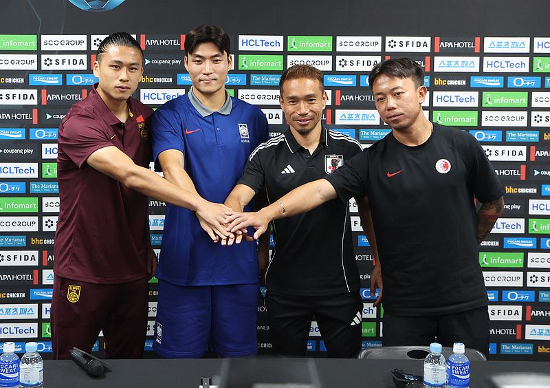 张玉宁(中国队)、朴镇燮(韩国队)、长友佑都(日本队)、李嘉豪(中国香港队)出席赛前发布会。(图/上海《文汇报》)