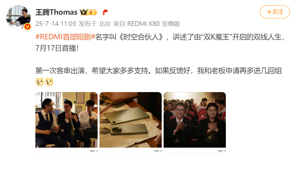 小米REDMI首部短剧《时空合伙人》定档,王腾等高管跨界参演