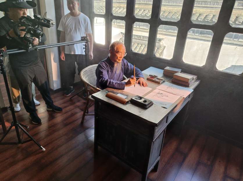 2023年7月26日,浙江桐乡缘缘堂,宋雪君扮演外公丰子恺现场作画写字。(图/中新社)