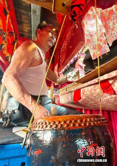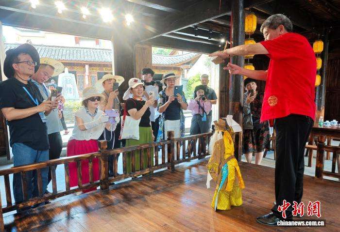 9月16日,福建省柘荣县富溪古镇布袋戏艺人正在为游客表演。当日,“把闽东之光传播开去”——海外华文媒体宁德行活动走进福建省柘荣县,来自12个国家16家海外华文媒体漫步田间、古街,亲身感受传统的文化韵律。中新社记者吕明摄