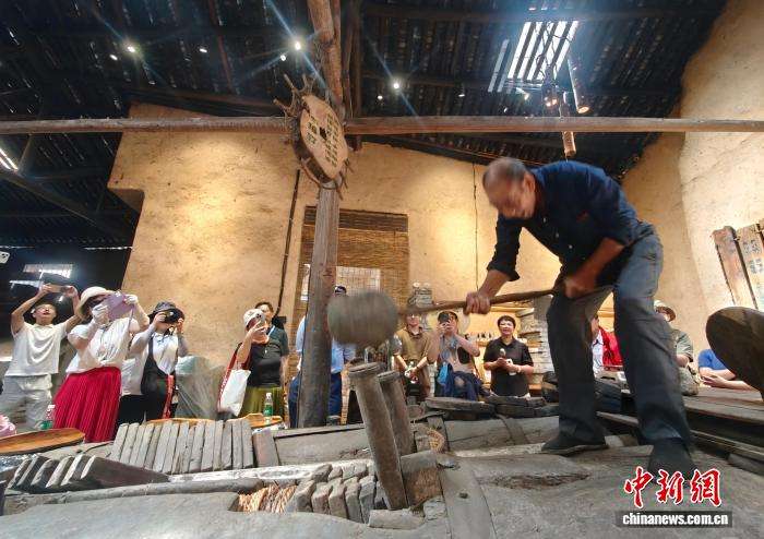 9月16日,福建省柘荣县富溪镇山茶油制作技艺第六代传承人游信玉正在演示传统山茶油制作技艺。当日,“把闽东之光传播开去”——海外华文媒体宁德行活动走进福建省柘荣县,来自12个国家16家海外华文媒体漫步田间、古街,亲身感受传统的文化韵律。中新社记者吕明摄