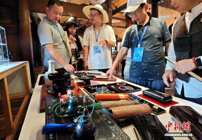 9月16日,福建省柘荣县富溪镇漆器文创品吸引海外华文媒体代表。当日,“把闽东之光传播开去”——海外华文媒体宁德行活动走进福建省柘荣县,来自12个国家16家海外华文媒体漫步田间、古街,亲身感受传统的文化韵律。中新社记者吕明摄