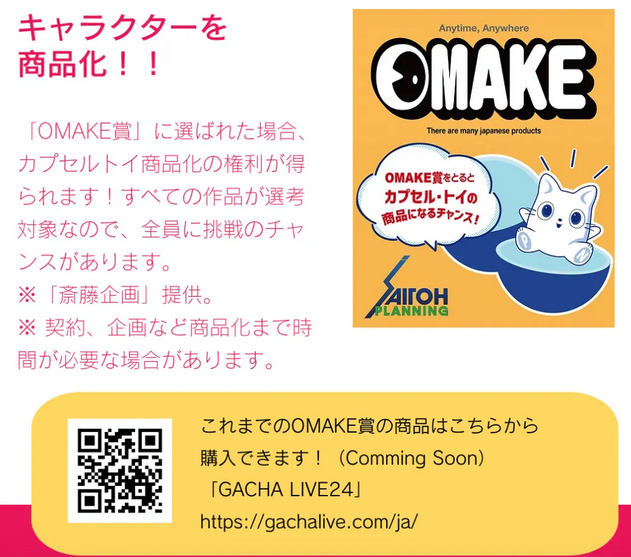 与往届一样,本次的OMAKE大赏获奖者将有机会与日本老牌扭蛋制造商“斋藤企划”合作,将其设计的IP角色转化为真实的扭蛋商品,并直接进入日本庞大的线下销售网络。对年轻创作者而言,这无疑是一条极具吸引力的“商业化快车道”。