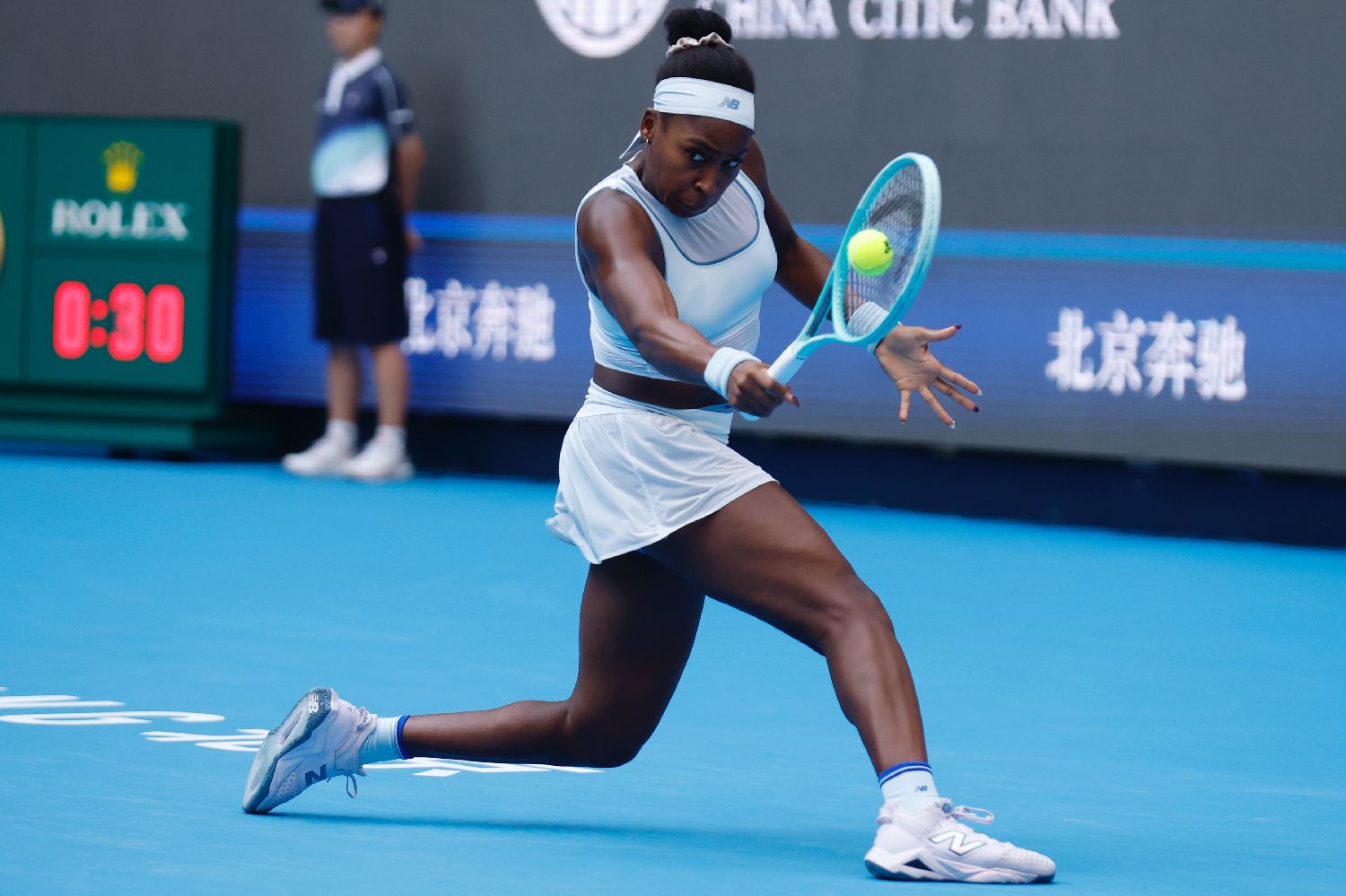 10月2日,在北京进行的2025中国网球公开赛女子单打四分之一决赛中,美国选手高芙以2:0战胜德国选手利斯,晋级四强。图为高芙在比赛中。(图/中新社)