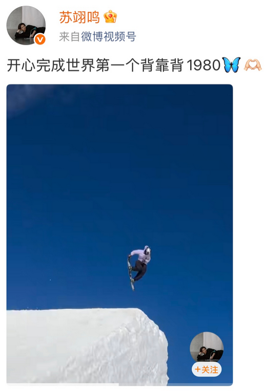 北京时间10月9日晚,中国单板滑雪运动员苏翊鸣在社交媒体平台晒出滑雪视频,并配文:开心完成世界第一个背靠背1980。