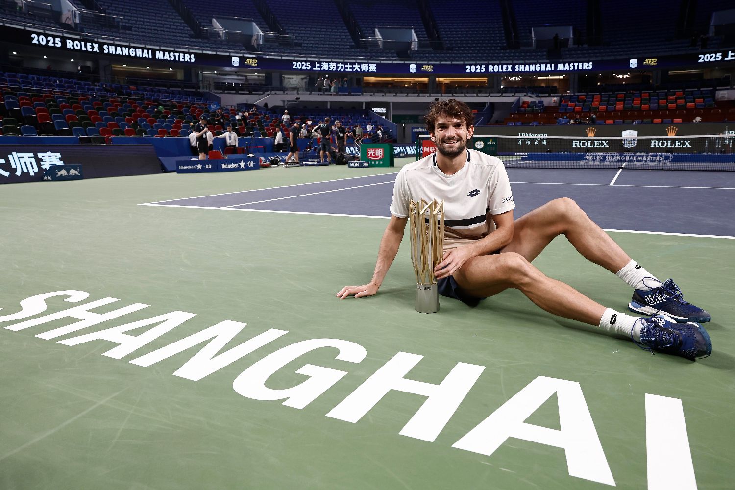 10月12日,瓦舍罗在2025上海网球大师赛决赛夺冠后与奖杯合影。(图/中新社)