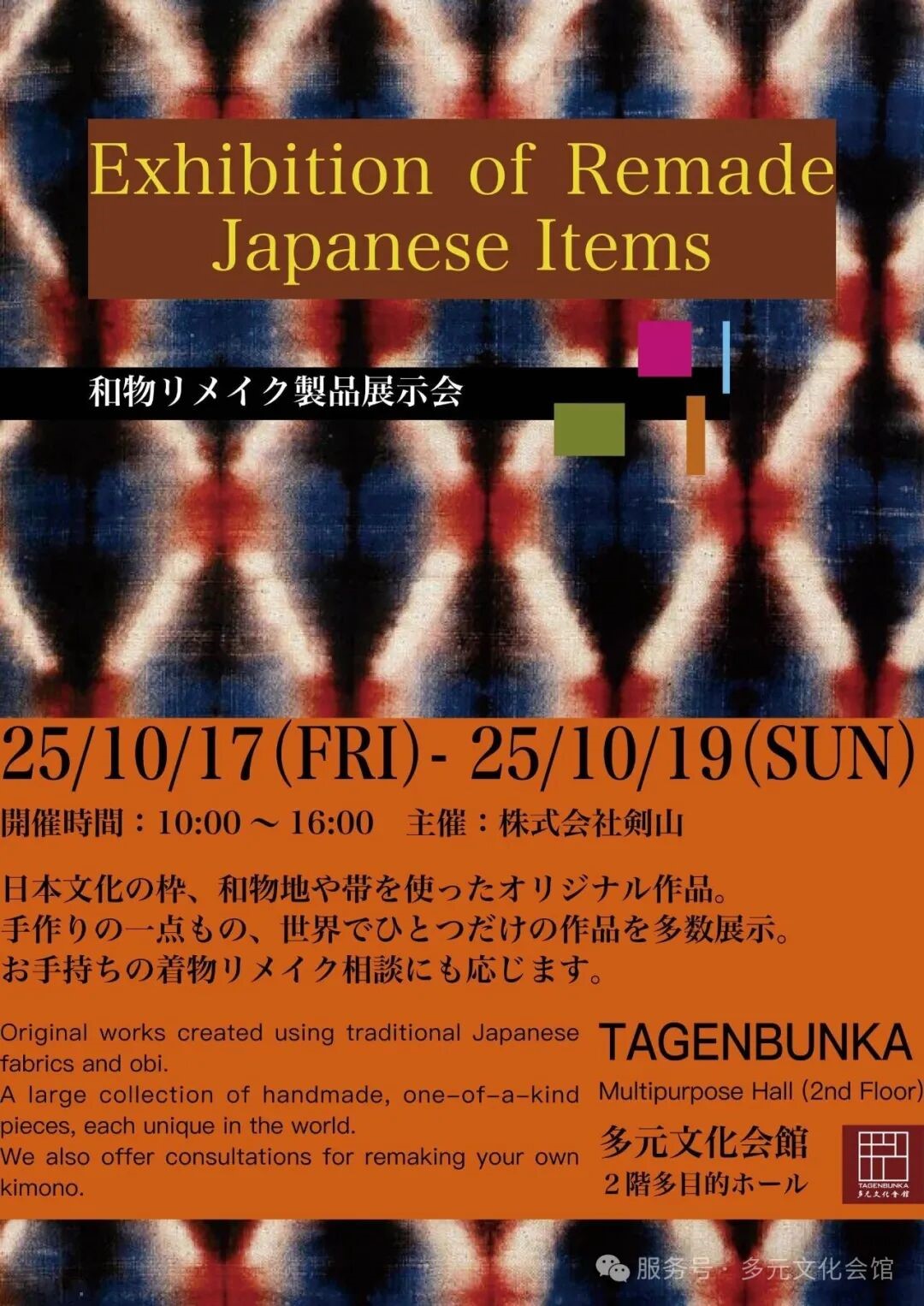 10月17日起至10月19日,为期3天时间,由多元文化会馆与株式会社剣山共同呈现一场关于和服传承、再生与和服现代化生活美学的展示会。这些多年以来专注于和服设计和制作的日本工匠大师,左手承以历史的和服布料,右手则与当代的设计灵感,探索着和服在今时今日的现代化表达。