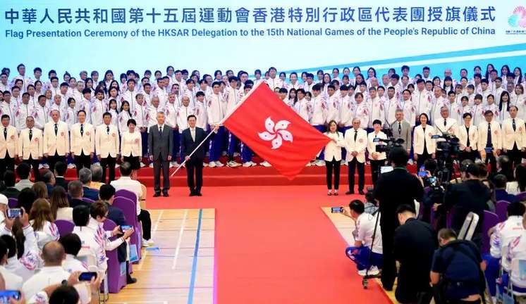参加第十五届全运会的香港代表团10月15日举行授旗仪式,标志着历史上规模最大的全运会香港代表团正式成立。图为授旗仪式现场。(图/新华社)
