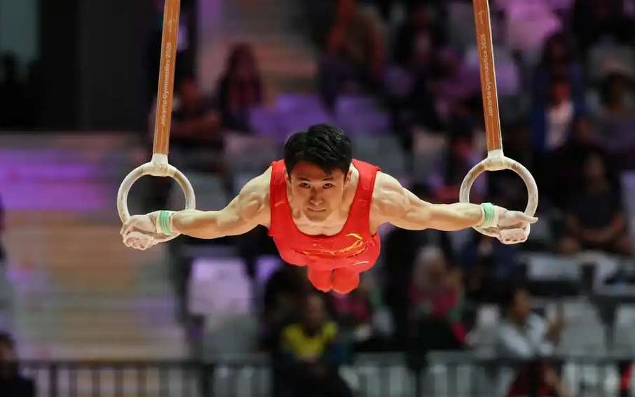 10月22日,中国选手侍聪在男子个人全能决赛吊环项目比赛中。(图/新华社)