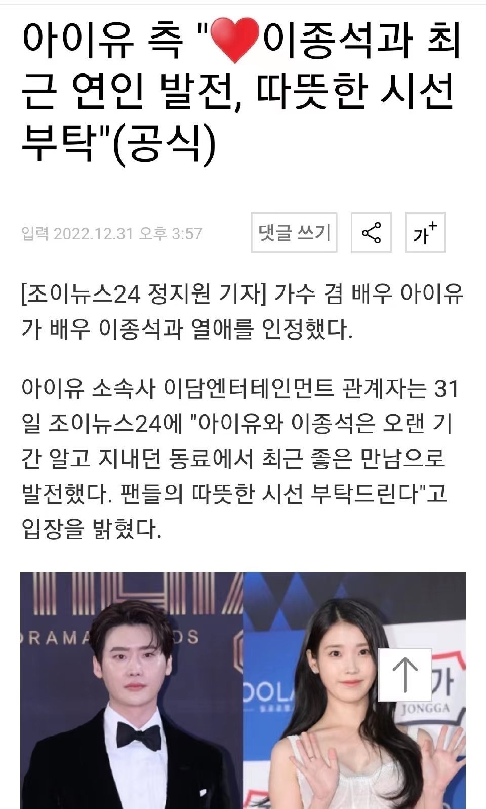 不久后IU所属经纪公司也通过媒体承认恋情,对方表示:希望粉丝们能以温暖的视线看待。