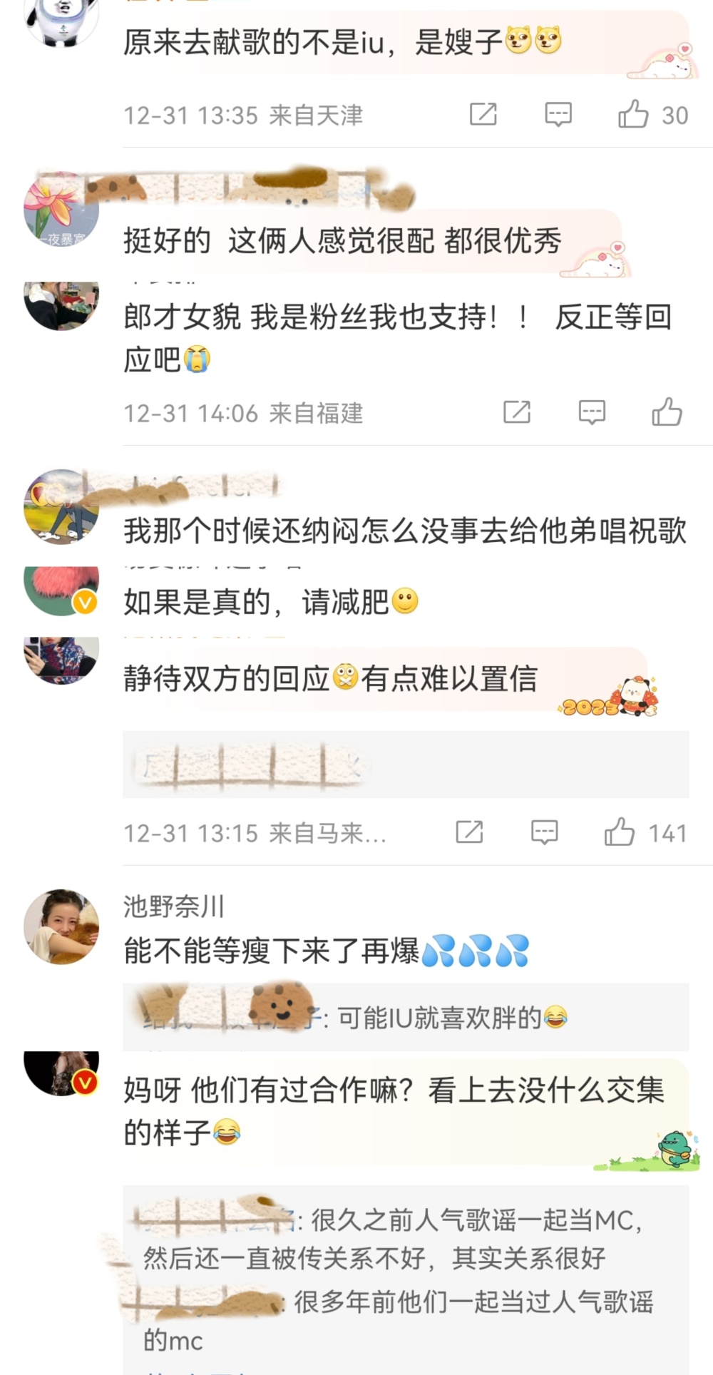 如今再回首过往的种种,对粉丝来说有种豁然开朗的感觉,终于明白为什么弟弟结婚,IU会现身唱歌,为什么李钟硕会唱IU的歌了,也有网友希望“幸福肥”的李钟硕可以多减减肥。整体来看,大家对于这对新恋情还是祝福为主,恭喜啦!