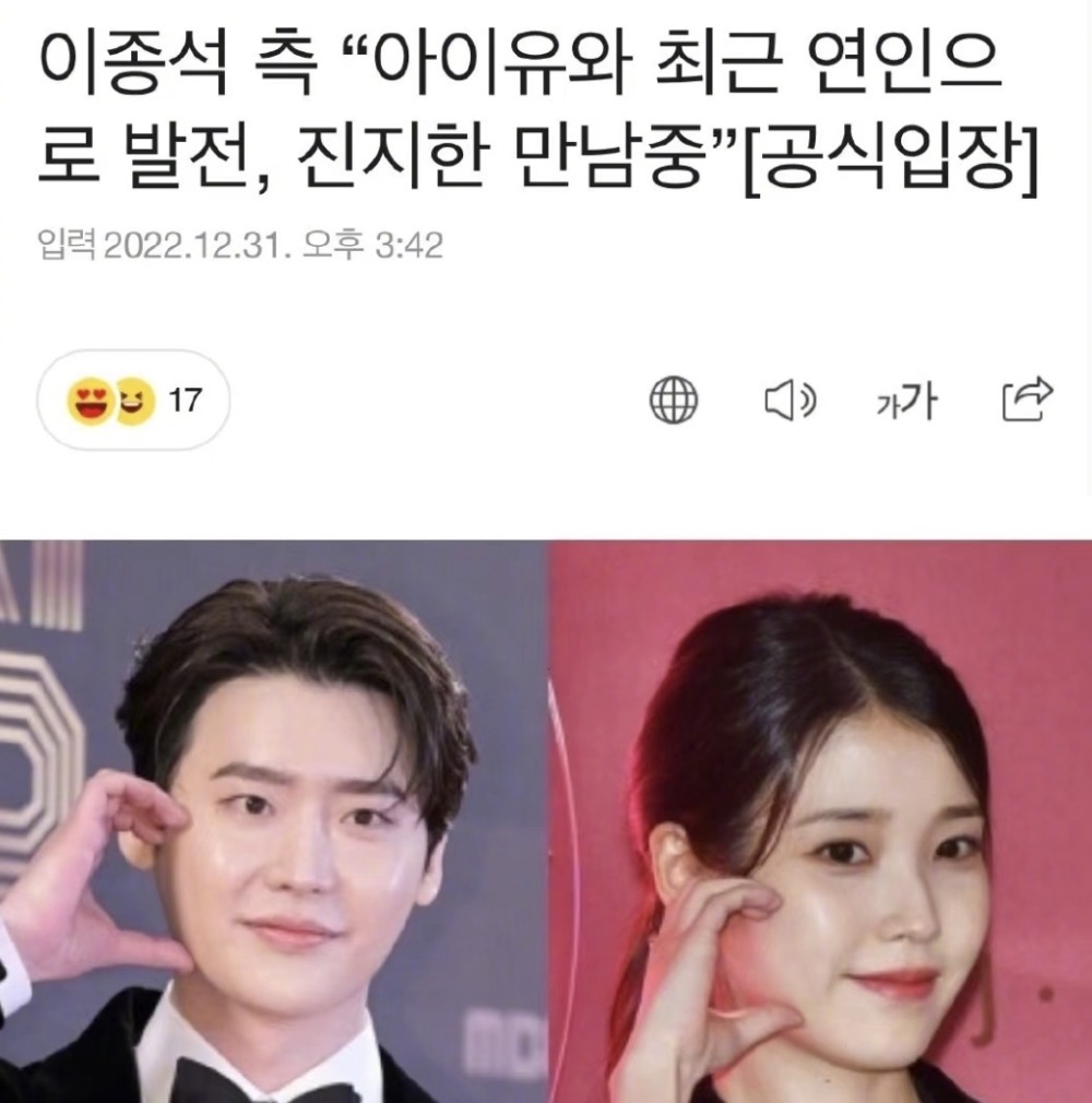 对此李钟硕经纪公司对外承认二人恋情:李钟硕与IU最近从同事关系发展为恋人,正在真挚地交往。