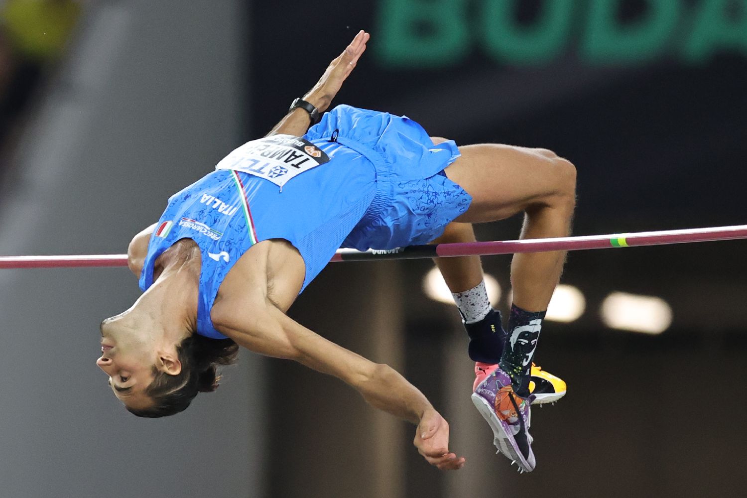 当地时间8月22日,布达佩斯田径世锦赛男子跳高决赛,意大利选手坦贝里夺得冠军。(图/中新社)
