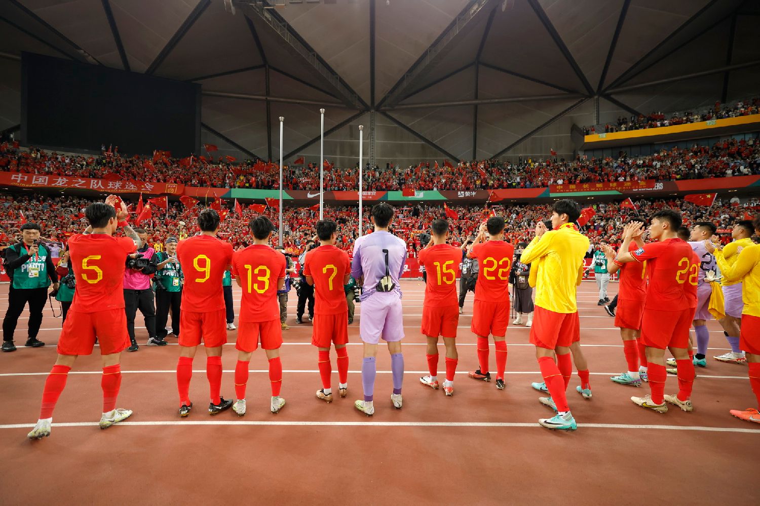 北京时间11月21日晚,在深圳进行的2026世界杯预选赛亚洲区36强赛C组第二轮比赛中,中国男足以0:3不敌韩国男足。图为中国队在赛后感谢球迷。(图/中新社)