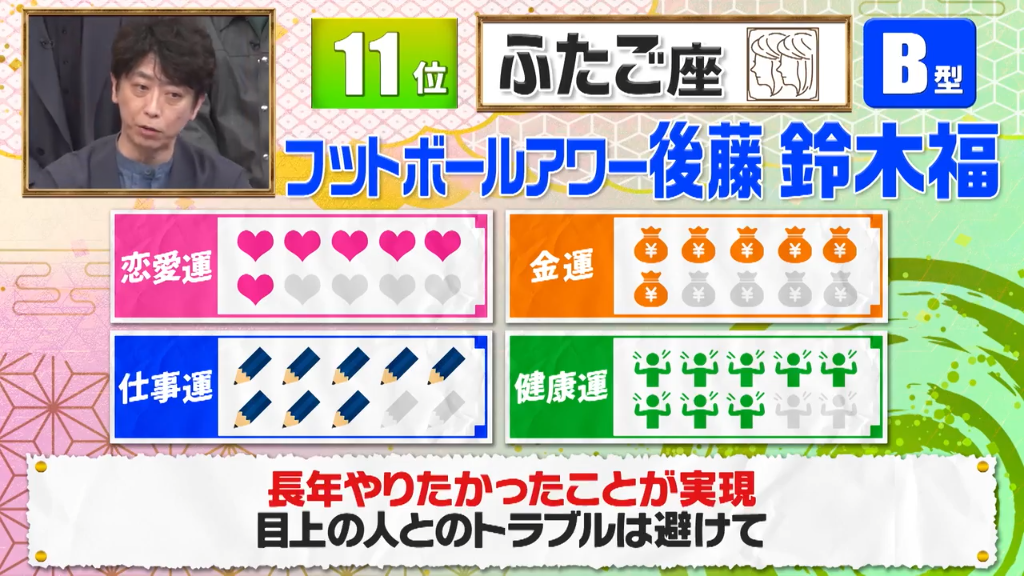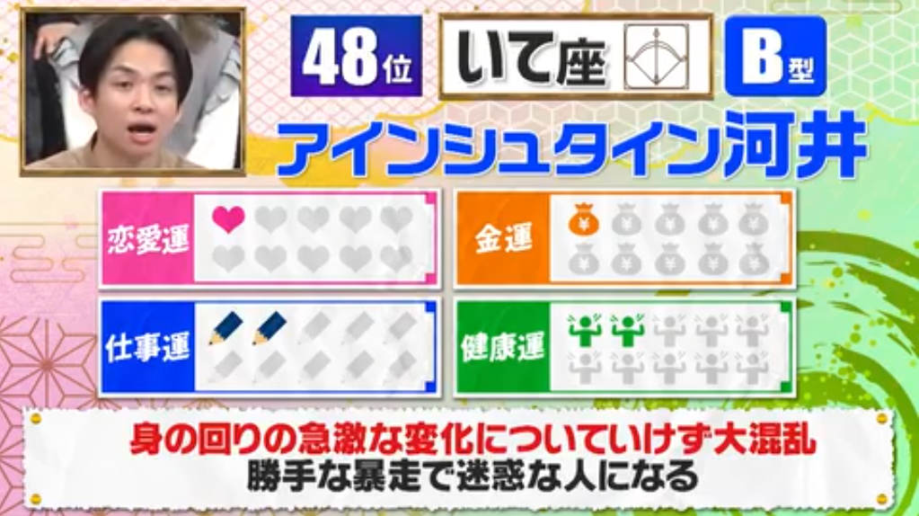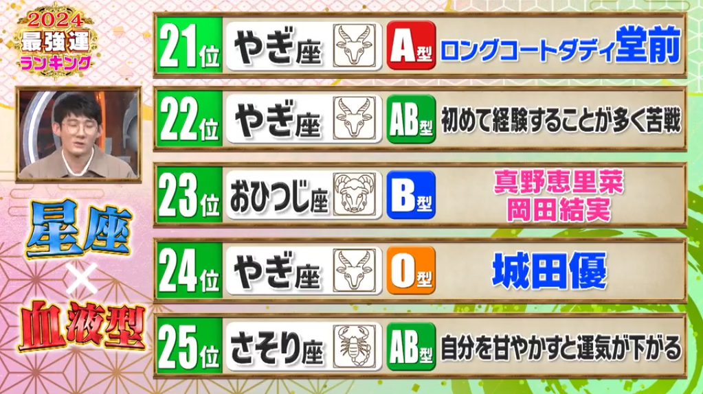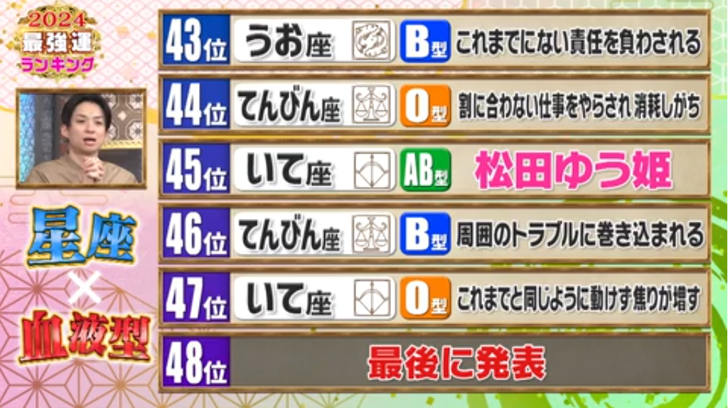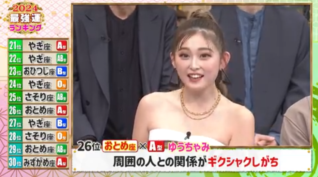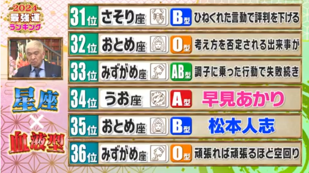 那么2024年,谁的运势最好呢?最近日综『ダウンタウンDX』就请来日本超有名的占卜师——水晶玉子,公开了2024年“星座&血型”最强运势排行榜!