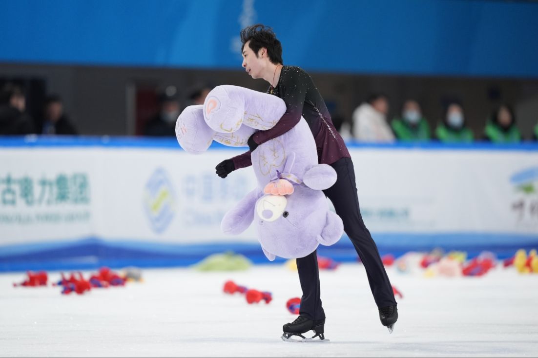 资料图:2月26日,第十四届全国冬季运动会花样滑冰公开组男单自由滑比赛在内蒙古呼伦贝尔举行。图为金博洋赛后怀抱毛绒玩具滑行。(图/中新社)