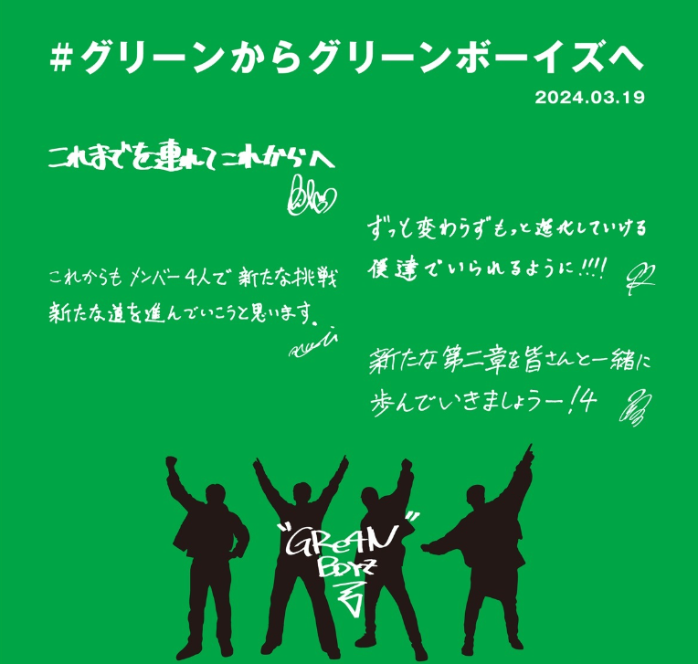 “作为GRe4N BOYZ,我们会重新尽全力去珍惜GRCReW(粉丝外号),以及今后与我们的音乐相遇的每一个人。对粉丝们、一直以来支持我们的工作人员们、以及所有的人表示感谢。”