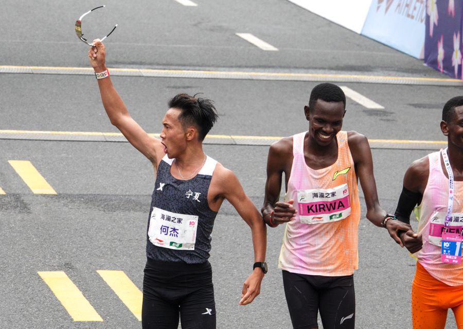 3月24日无锡马拉松,何杰(左)在比赛后庆祝。(图/新华社)