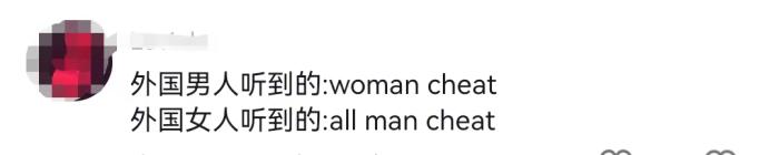 男人听到的是woman cheat(女人欺骗),女人听到的是all man cheat(男人欺骗)。