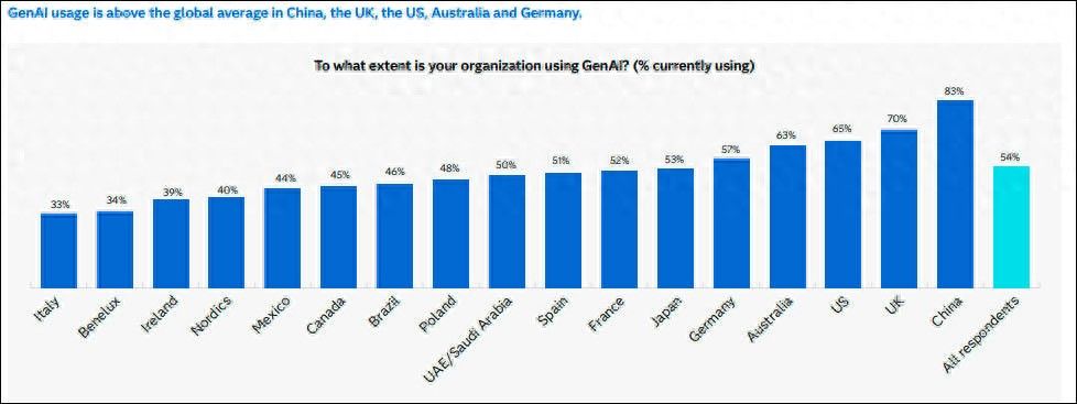 美国人工智能和分析软件公司SAS以及科尔曼·帕克斯研究公司(Coleman Parkes Research)近期对全球1600名行业决策者进行了一项调查。报告显示,83%的中国受访者表示他们已使用了生成式人工智能技术,这一比例高于参与调查的其他16个国家和地区,紧随其后的是英国(比例为70%)和美国(65%)。
