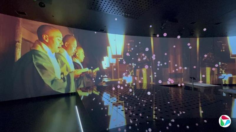 记者采访当天获准进入关西八县城的联合展馆。这个展馆将当地的文化美景与艺术结合,通过投影将关西美丽的琵琶湖和鸟取的沙丘融为一体,让人一饱眼福。