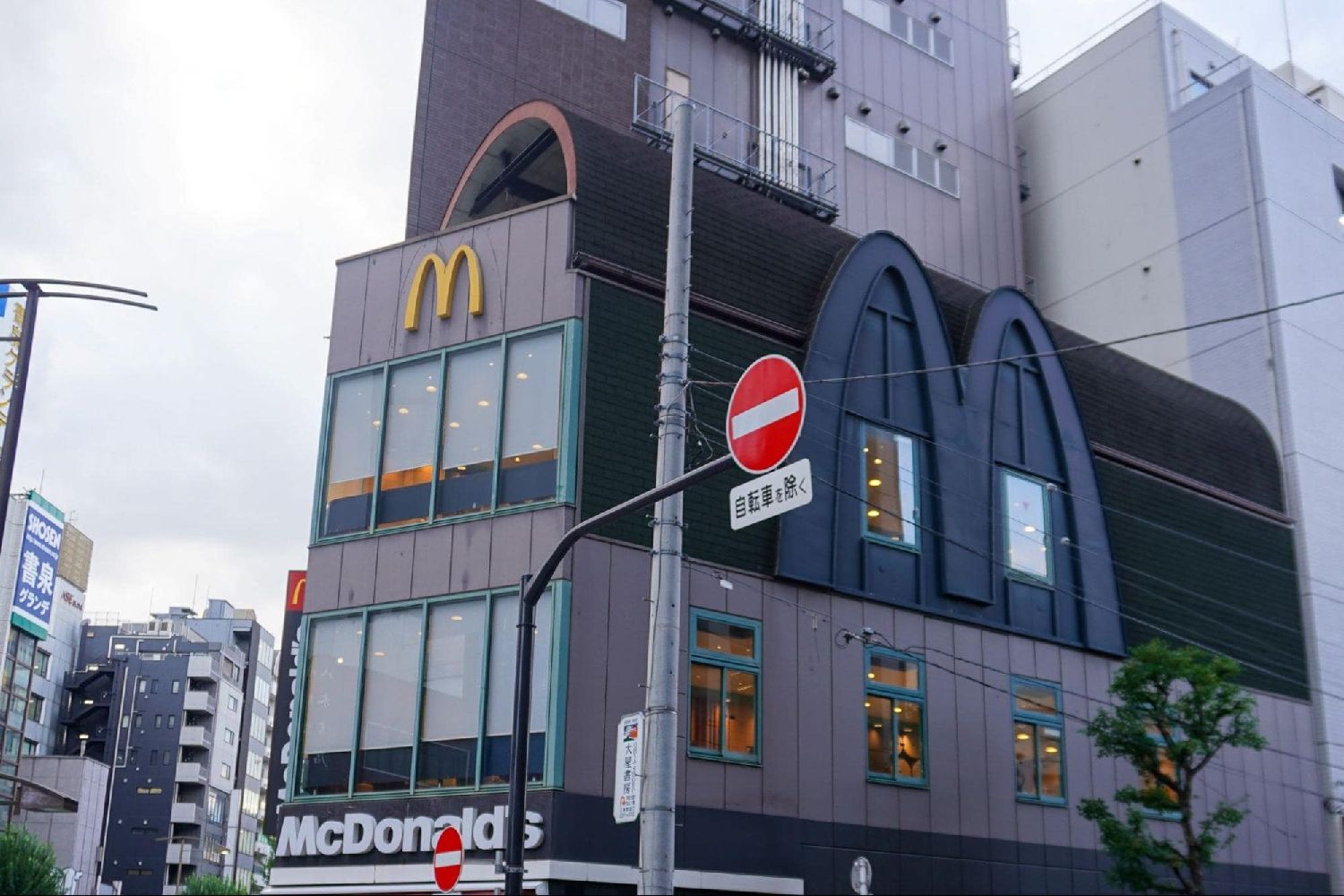 神保町是东京著名的古书店街,街区历史氛围浓厚,与通常以鲜艳红黄配色出现的麦当劳门店形成鲜明对比。在该区域,一处高达3米的大型立体M字招牌尤为引人注目,但其采用低调的黑色设计,与背景建筑几乎融为一体,许多路人甚至未曾察觉其存在。