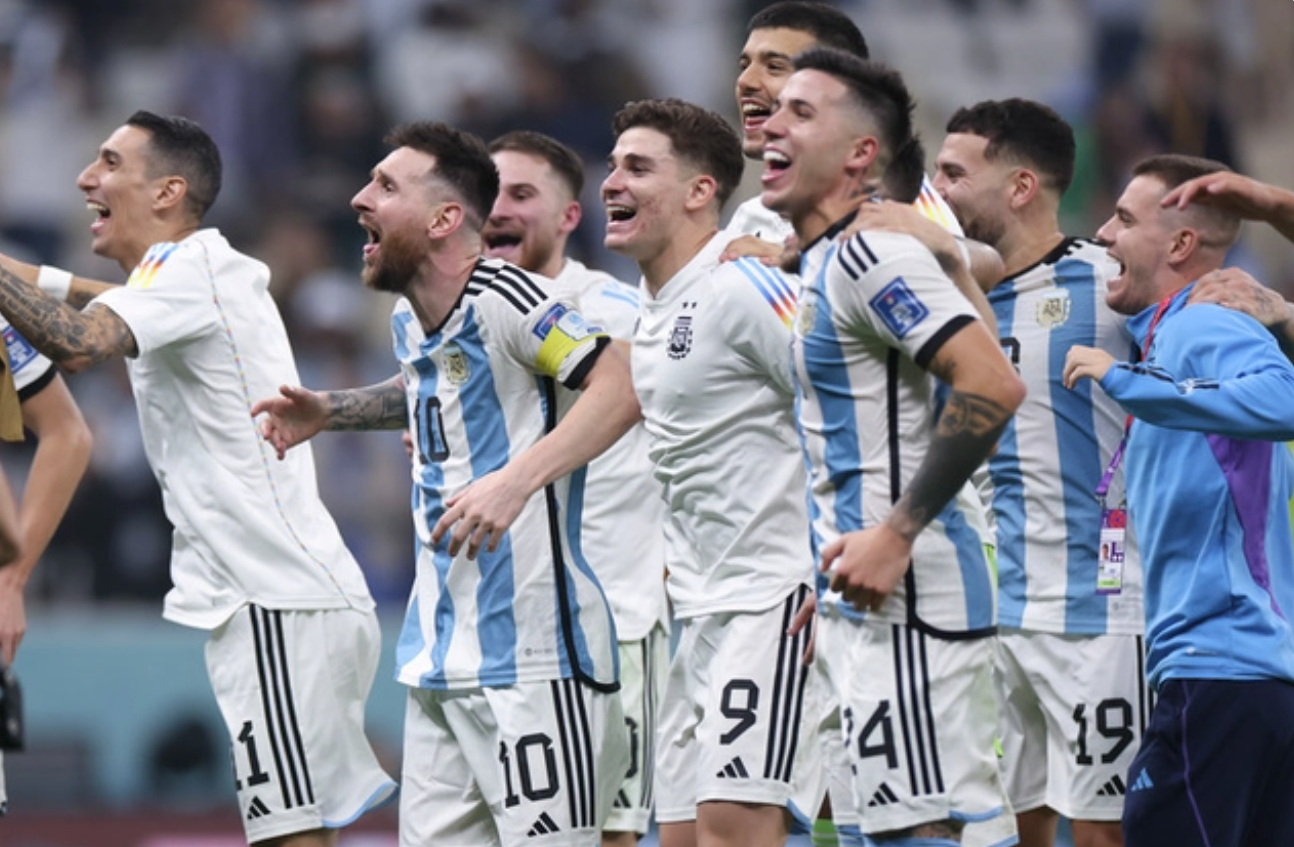 阿根廷队进世界杯决赛,图为阿根廷队球员梅西(左二)在半决赛后与队友庆祝。(图/新华社)