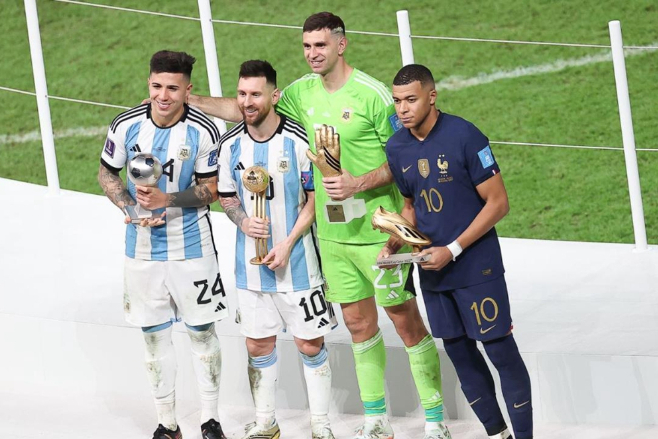 从左到右依次为:最佳新秀奖恩佐、“金球”奖梅西、“金手套”奖马丁内斯、“金靴”奖姆巴佩。(图/河南大象新闻)