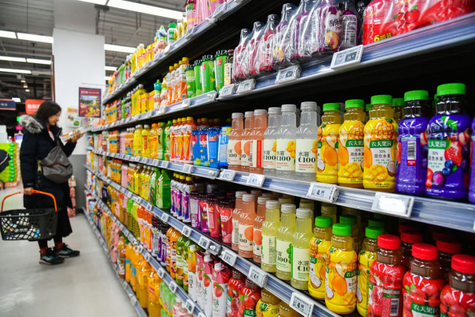 2023年11月18日,消费者正在北京一家物美超市里选购果汁饮料。视觉中国|图