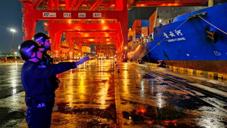 当地时间10月30日18时许,搭载第八届进博会海运展品集装箱货轮“青云河”轮靠泊上海外高桥口岸。上海边检总站外高桥边检站联合口岸单位开通进博展品“绿色通道”,助力第八届进博会展品安全准时入境布展。