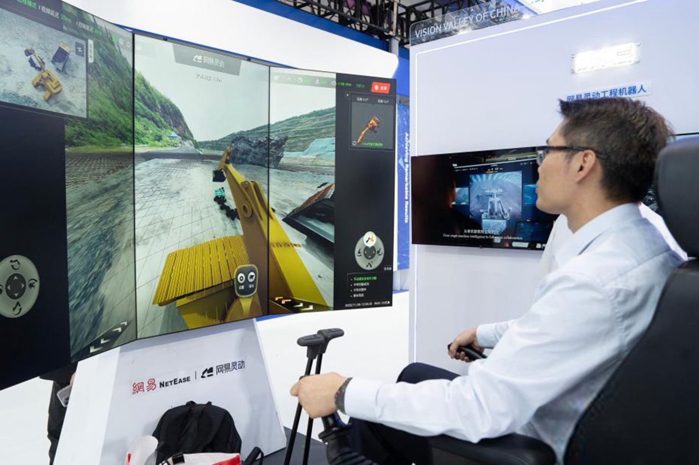 11月6日,观众在“互联网之光”博览会上体验工程机器人。(中新社)