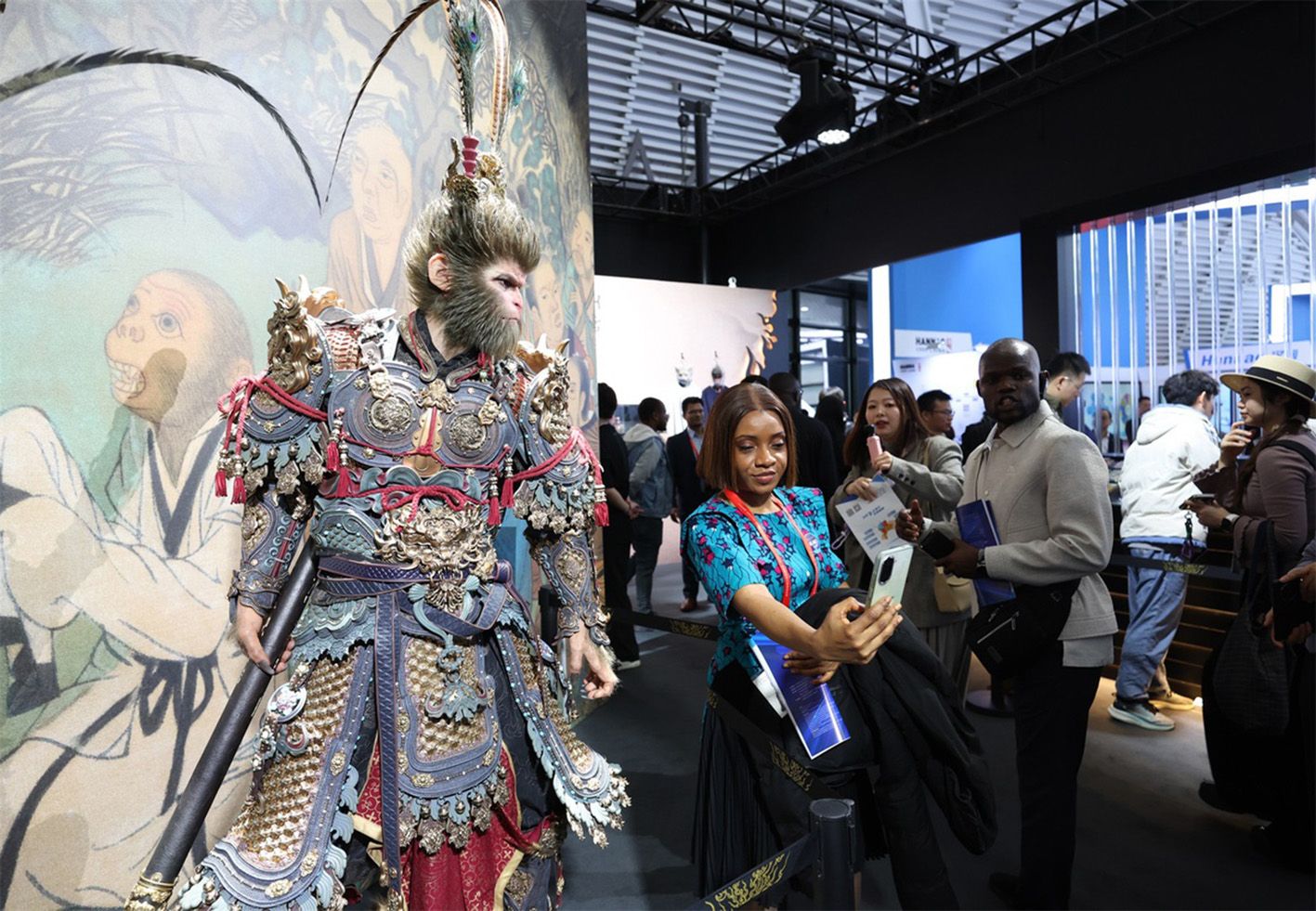 11月6日,与会嘉宾在《黑神话:悟空》展台自拍留影。(北京《中国日报》)