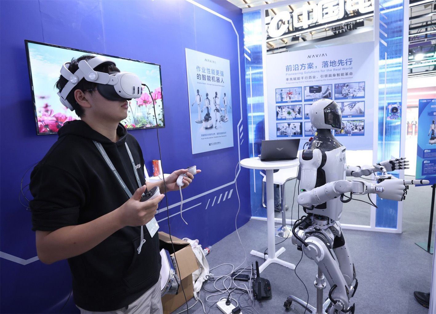 11月6日,在2025年世界互联网大会“互联网之光”博览会现场,一家企业工作人员展示人形机器人同步模仿精细动作。(新华社)
