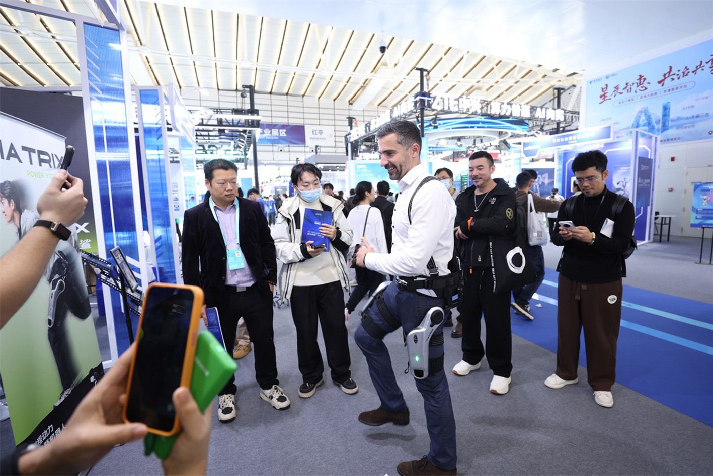 11月6日,与会嘉宾体验外骨骼机器人。(北京《中国日报》)