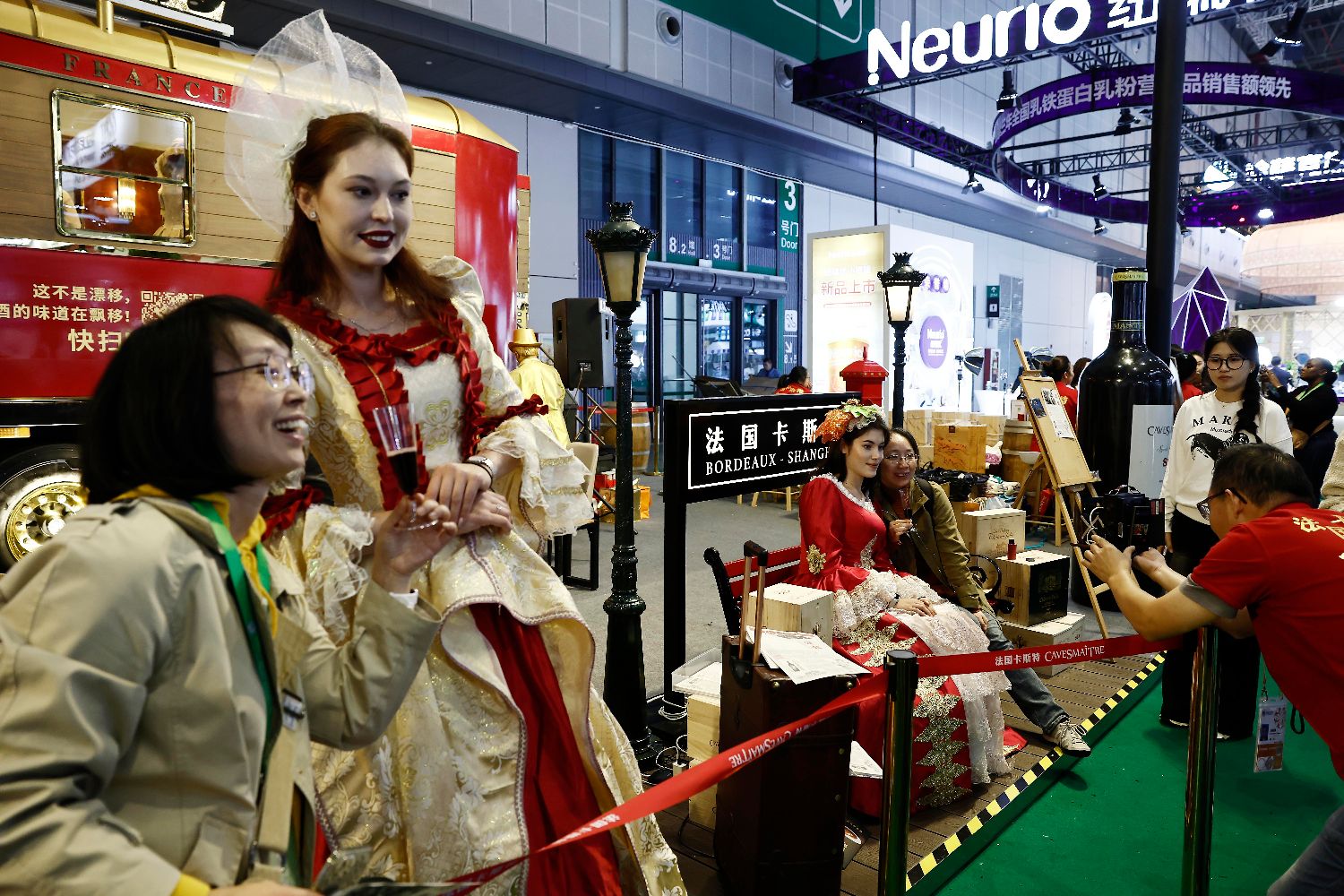 图为11月10日,在农食产品展区,观众与模特合影。(中新社)