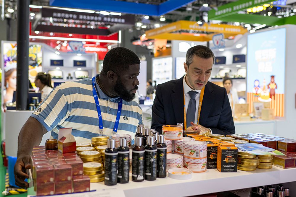 图为农食产品展区,外国参展商正在了解来自非洲的乳木果油护肤品。(人民网)