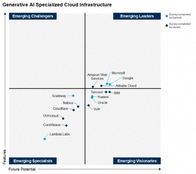 在“面向GenAI的基础设施”的维度,报告关注云厂商面向模型训练、推理和服务所提供的基础设施优化。新兴领导者象限仅有阿里云、微软、谷歌、AWS四家厂商入围,阿里云是唯一入围亚太厂商。华为云和腾讯云则位于远见者象限。