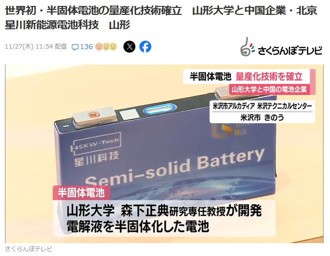 山形大学下设企业BIH与一家中国企业近日宣布,在全球范围内首次成功实现混合动力车用“半固态电池”量产技术。