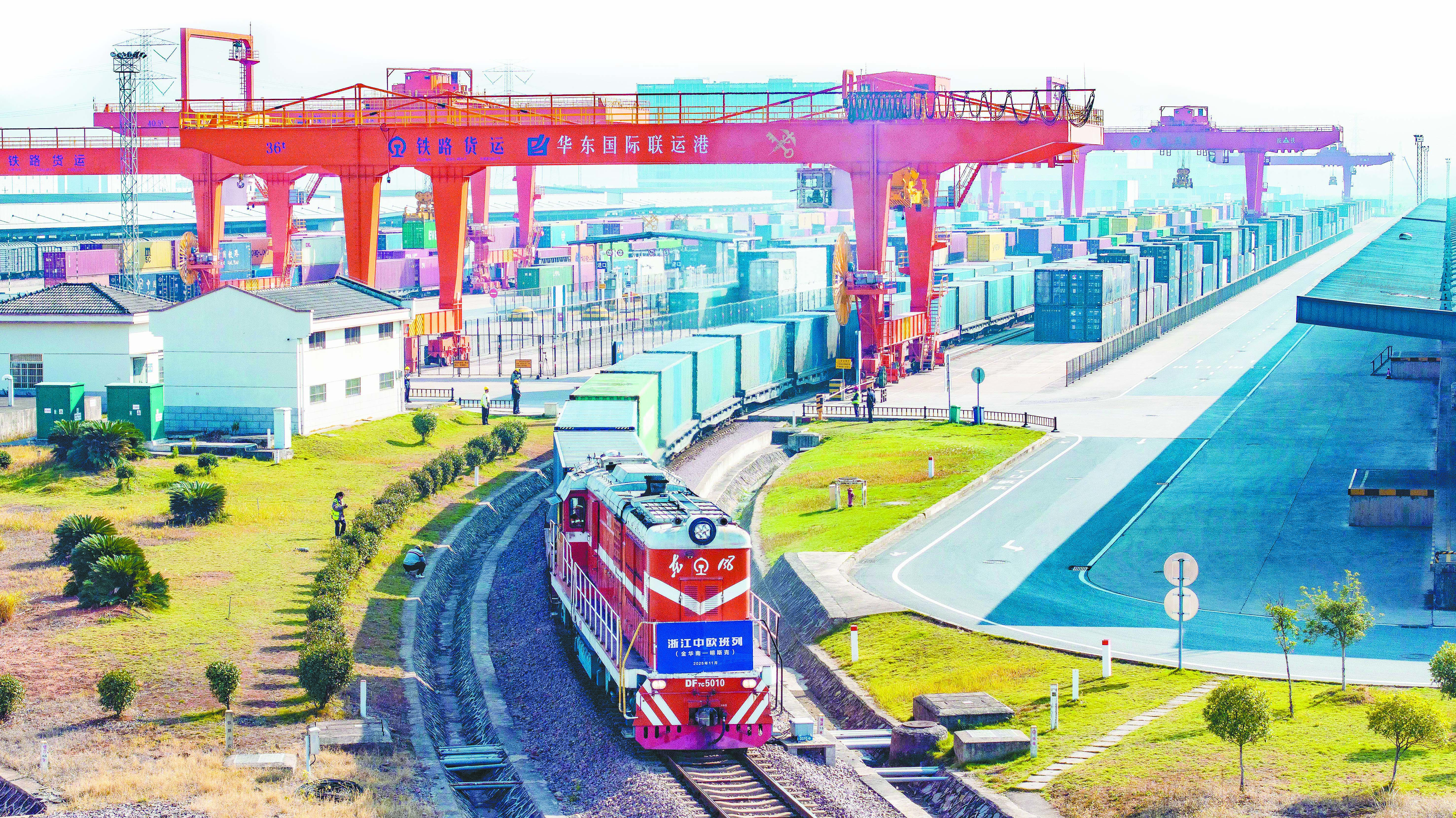11月22日,浙江金华,一列满载新能源设备、电器元件、日用百货等货物的中欧班列从金华南站驶出。(视觉中国)