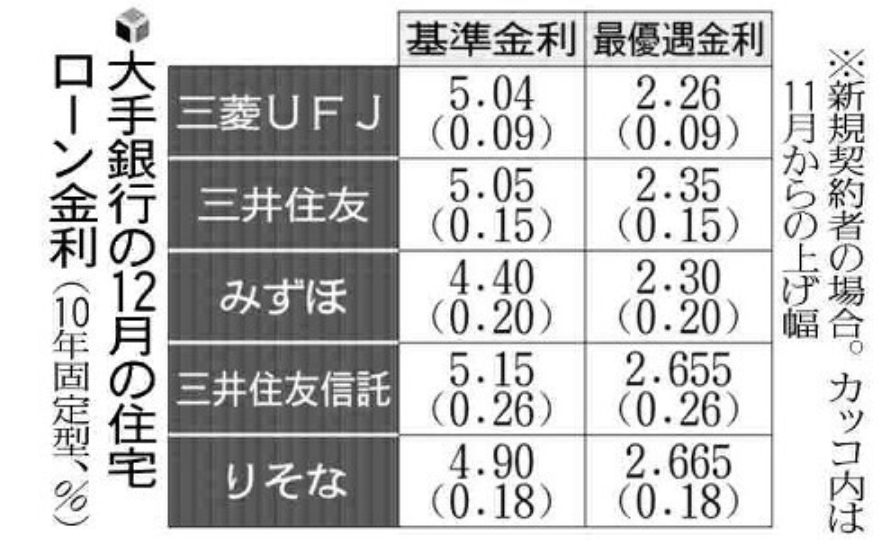 (亚太快讯消息)根据《读卖新闻》,日本五大银行11月28日公布12月起适用的住房贷款利率,其中10年期固定利率全面上调至年4.40%至5.15%不等。三菱UFJ、三井住友、瑞穗及三井住友信托银行的利率水平均创机构成立以来最高,主要反映近期日本长期国债收益率持续走高。