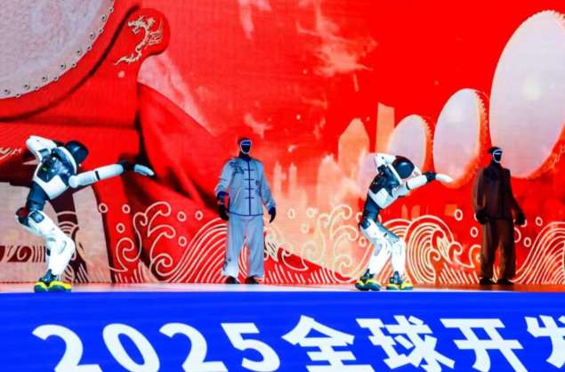 13日,全球开发者先锋大会暨国际具身智能技能大赛(GDPS2025)开幕式在上海举行,在春晚秀舞姿的宇树机器人和上海本土企业智元机器人首度同台协作“炫技”。