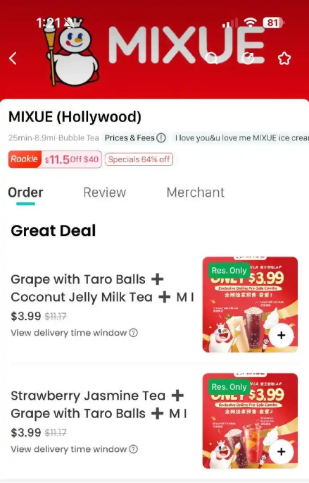 蜜雪冰城进军北美市场,美国外卖平台预售套餐3.99美元